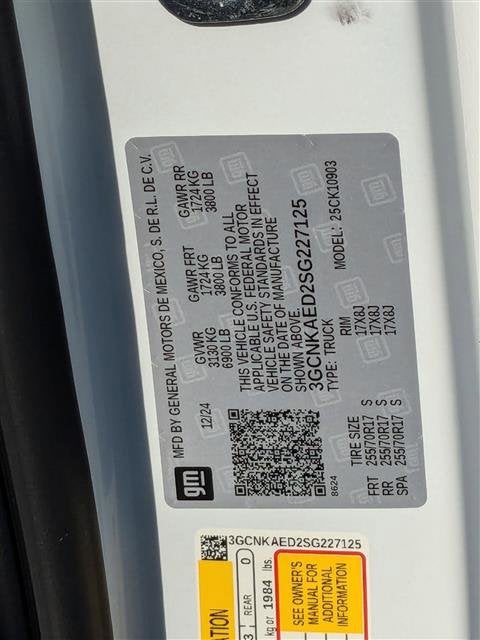 2025 Chevrolet Silverado 1500 WT CHECK OUT ALL THESE GREAT OPTIONS Preferred Equipment Group 1WT (3.5 Monochromatic Display Driver Info Center, 4-Way Manual Driver Seat Adjuster, Black (Semi-Gloss) Front Bumper, Black (Semi-Gloss) Rear Bumper, Bluetooth娨 For Phone, Electronic Cruise Control, Front Frame-Mounted Black Recovery Hooks, HD Rear Vision Camera, Heated Power-Adjustable Outside Mirrors, Inside Rear-View Mirror w/Tilt, Locking Tailgate, Manual Tailgate Function w/No EZ Lift, Manual Tilt Wheel Steering Column, OnStar Services Capable, Power Front Windows w/Driver Express Up/Down, Power Front Windows w/Passenger Express Down, Remote Keyless Entry, Rubberized-Vinyl Floor Covering, SiriusXM Delete, Solar Absorbing Tinted Glass, Standard Tailgate, Teen Driver, Tire Pressure Monitoring System, and Wi-Fi Hot Spot Capable), Standard Suspension Package, Trailering Package (Hitch Guidance), 170 Amp Alternator, 2 Speakers, 2-Speaker Audio System, 220 Amp Alternator, 4-Wheel Disc Brakes, 40/20/40 Front Split Bench Seat, ABS brakes, Air Conditioning, Apple CarPlay/Android Auto, Auto High-beam Headlights, Auto-Locking Rear Differential, Automatic Emergency Braking, Auxiliary External Transmission Oil Cooler, Brake assist, Compass, Delay-off headlights, Driver door bin, Dual front impact airbags, Dual front side impact airbags, Electronic Stability Control, Emergency communication system: OnStar, External Engine Oil Cooler, Following Distance Indicator, Forward Collision Alert, Front anti-roll bar, Front Center Armrest w/Storage, Front License Plate Kit, Front Pedestrian Braking, Front reading lights, Front wheel independent suspension, Fully automatic headlights, Heated door mirrors, Illuminated entry, IntelliBeam Automatic High Beam On/Off, Lane Keep Assist w/Lane Departure Warning, Low tire pressure warning, Occupant sensing airbag, Outside temperature display, Overhead airbag, Overhead console, Panic alarm, Passenger door bin, Passenger vanity mirror, Power door mirrors, Power steering, Power windows, Premium audio system: Chevrolet Infotainment 3, Radio data system, Radio: Chevrolet Infotainment 3 System, Rear reading lights, Rear step bumper, Remote keyless entry, Speed control, Speed-sensing steering, Tachometer, Tilt steering wheel, Traction control, Trip computer, Variably intermittent wipers, Vinyl Seat Trim, Voltmeter, and Wheels: 17 x 8 Ultra Silver Painted Steel.