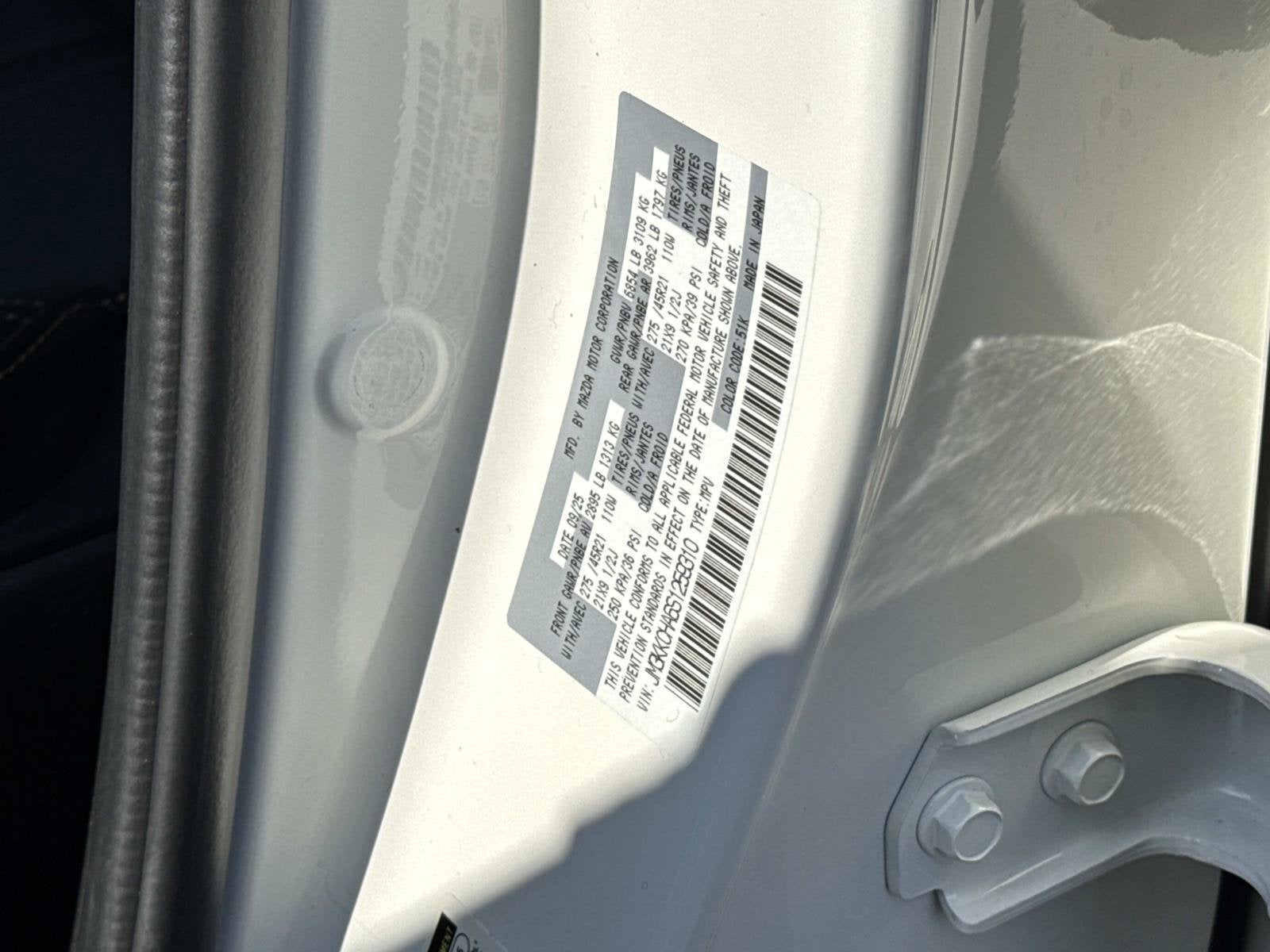 CHECK OUT ALL THESE GREAT OPTIONS 12 Speakers, 3rd row seats: bench, 4-Wheel Disc Brakes, ABS brakes, Air Conditioning, Alloy wheels, AM/FM radio: SiriusXM, Auto High-beam Headlights, Auto-dimming Rear-View mirror, Automatic temperature control, Brake assist, Bumpers: body-color, Cargo Blocks, Compass, Delay-off headlights, Driver door bin, Driver vanity mirror, Dual front impact airbags, Dual front side impact airbags, E911 Automatic Emergency Notification, Electronic Stability Control, Emergency communication system: MAZDA CONNECT, Exterior Parking Camera Rear, Four wheel independent suspension, Front anti-roll bar, Front Bucket Seats, Front Center Armrest w/Storage, Front dual zone A/C, Front reading lights, Fully automatic headlights, Garage door transmitter: HomeLink, Heads-Up Display, Heated door mirrors, Heated Front Bucket Seats, Heated front seats, Illuminated entry, Infotainment System Voice Command, Knee airbag, Leather Seat Trim, Leather Shift Knob, Leather steering wheel, Low tire pressure warning, Mazda Connected Services, Mazda Navigation System, Memory seat, Navigation system: MAZDA CONNECT, Occupant sensing airbag, Outside temperature display, Overhead airbag, Overhead console, Pandora Internet Radio Integration, Panic alarm, Passenger door bin, Passenger vanity mirror, Power door mirrors, Power driver seat, Power Liftgate, Power moonroof, Power passenger seat, Power steering, Power windows, Radio Broadcast Data System Program Information, Radio data system, Radio: AM/FM w/HD/Bose 12-Speaker Sound System, Rain sensing wipers, Rear air conditioning, Rear anti-roll bar, Rear reading lights, Rear seat center armrest, Rear window defroster, Rear window wiper, Remote keyless entry, Rhodium White Premium Paint Charge, Roadside Assistance Kit, SMS Text Msg Audio Delivery & Reply, Speed control, Speed-sensing steering, Split folding rear seat, Spoiler, Steering wheel mounted audio controls, Tachometer, Telescoping steering wheel, Tilt steering wheel, Traction control, Trip computer, Turn signal indicator mirrors, Variably intermittent wipers, and Wheels: 21 x 9.5J Aluminum Alloy.
